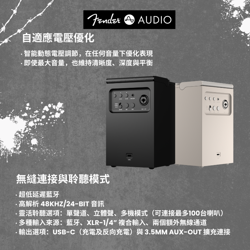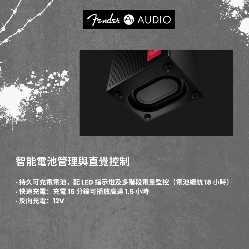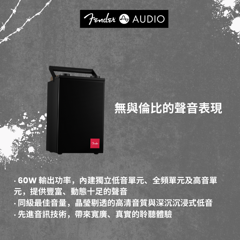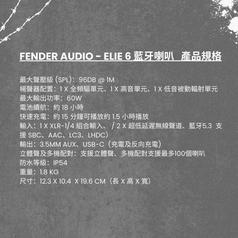 ELIE 6 是 Fender Audio 旗下的強力便攜藍牙喇叭,專為追求極致音量、動態與沉浸式體驗而設計。搭載 60W 輸出、三單體配置(高音 + 全頻 + 獨立低音單元),帶來深沉低頻、寬闊音場與清晰細節。