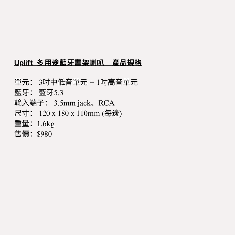 UPLIFT 看似小巧,卻有著左右獨立音箱所帶來豐富的立體感,有別於傳統音響,作為一對主動式書架喇叭,插電即可使用,不單只可以 RCA 及 AUX in 連接電腦、黑膠唱盤等器材,更支援藍牙無線接收功能,輕鬆享受手機上的音樂。