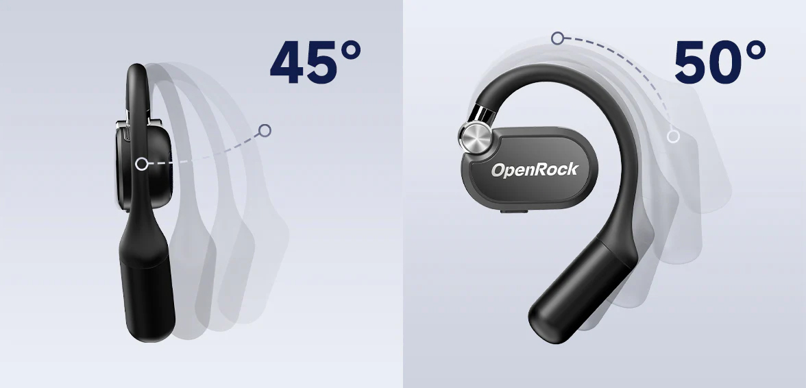 OpenRock X以一款能滿足所有戶外活動的耳機為目標,雙軸心轉軸耳掛以人體工學精心設計,由特製合金定制,可作垂直/橫向雙向轉動,50°無段式調節角度可固定於任何一個位置,完美貼合不同耳型,比起一般運動耳機帶來更個人化、更大自由度的佩戴體驗。均衡的前後重量分佈讓耳機在劇烈運動時都不易鬆脫,時刻穩定掛在耳上。