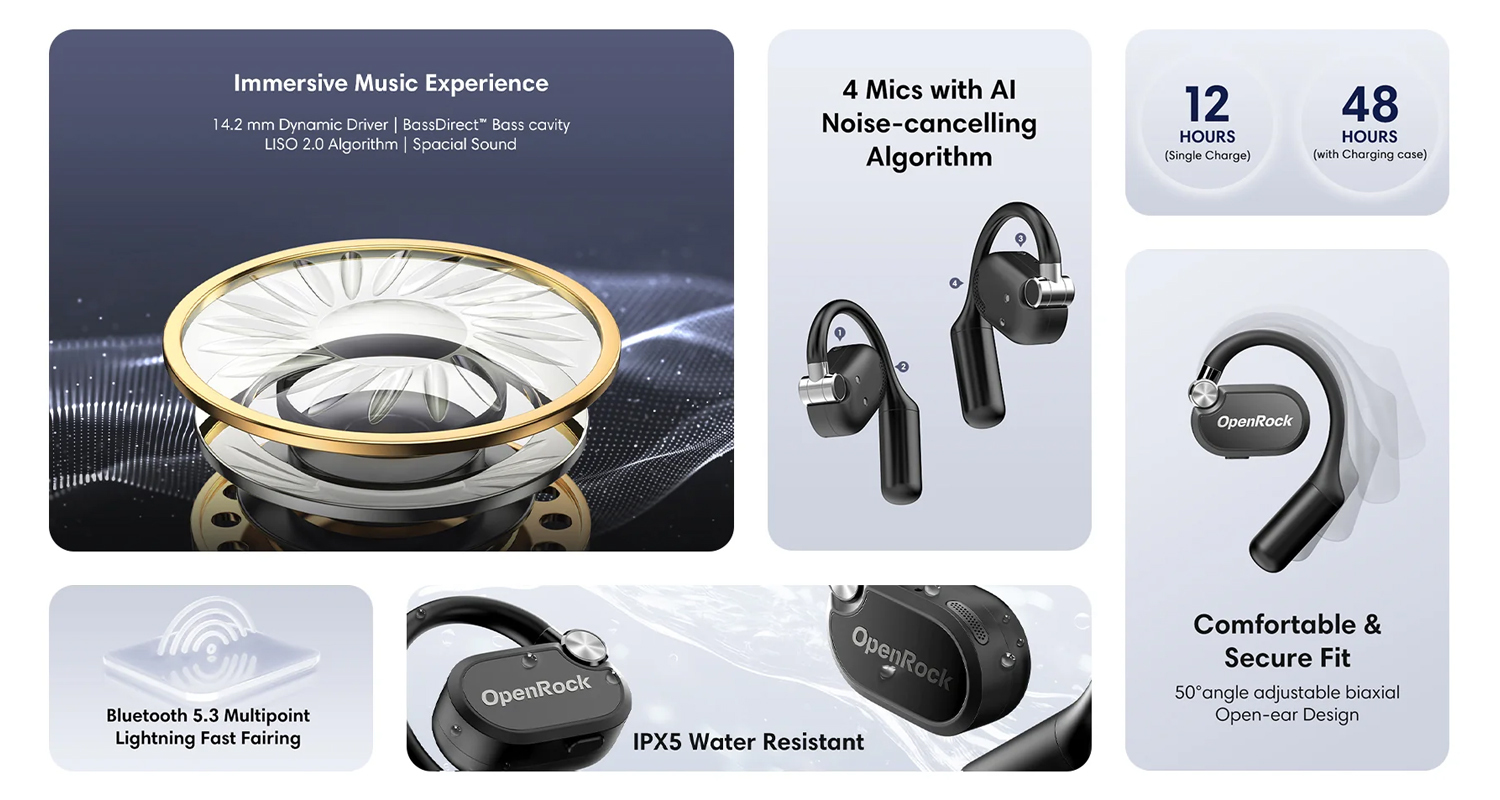 OpenRock X 的高性能讓用家們可以放心在戶外活動時使用,耳機單次充電就可使用長達 12小時,玩足半日; IPX5 防水機身在沙灘、溪澗行走時都更加安心,亦都無懼突如其來的雨水侵襲。另外,OpenRock X 不只聽得出色,耳機特設 4 組麥克風收音及 AI 人工智能降噪運算法,在風噪較強的戶外環境一樣可以清晰進行語音通話,與親友、工作伙伴保持聯繫。