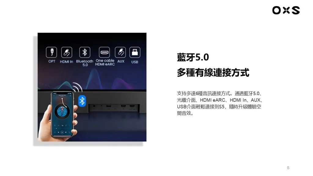 .附設HDMI、光纖、USB、藍牙、AUX、5mm 端子,連接不同器材